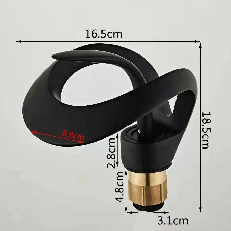 - Made from solid brass for durability and reliability. - Finished in high-quality, corrosion-resistant black paint. - With a waterfall spout that creates a gentle cascade of water. - Suitable for installation on a sink with a single hole. - Not suitable for low pressure. The minimum required water pressure is 0.05 MPa (0.5 bar). - Faucet only, no valve, no hose, no mounting hardware.