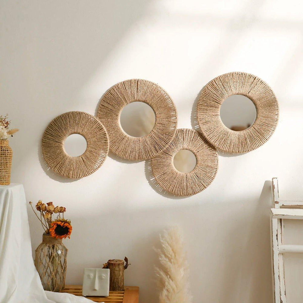 BowLift | Round decorative wall mirror in boho style with woven hemp rope